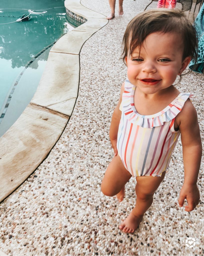 Came home to this gummy girl having one tooth coming through! Her swimmie is sold out but we linked our favs here!
