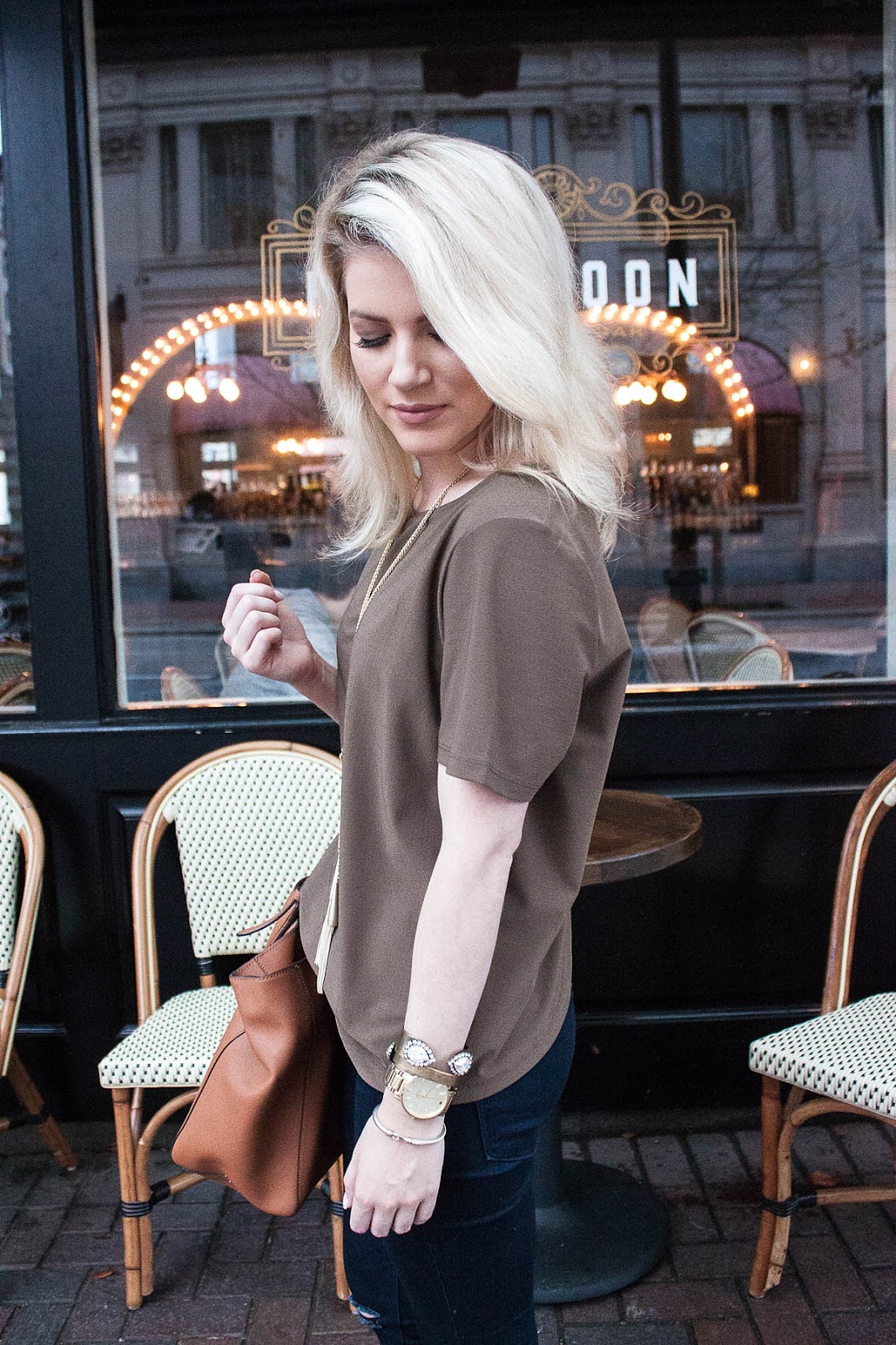 LEITH TOP | FLYING MONKEY DENIM | KENDRA SCOTT NECKLACE | LOREN HOPE CUFFS | DAVID YURMAN BANGLE | KATE SPADE WATCH | TORY BURCH TOTE & WALLET | STEVE MADDEN HEELS | RAYBAN SUNGLASSES