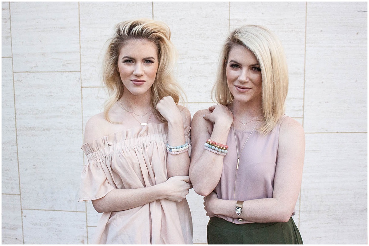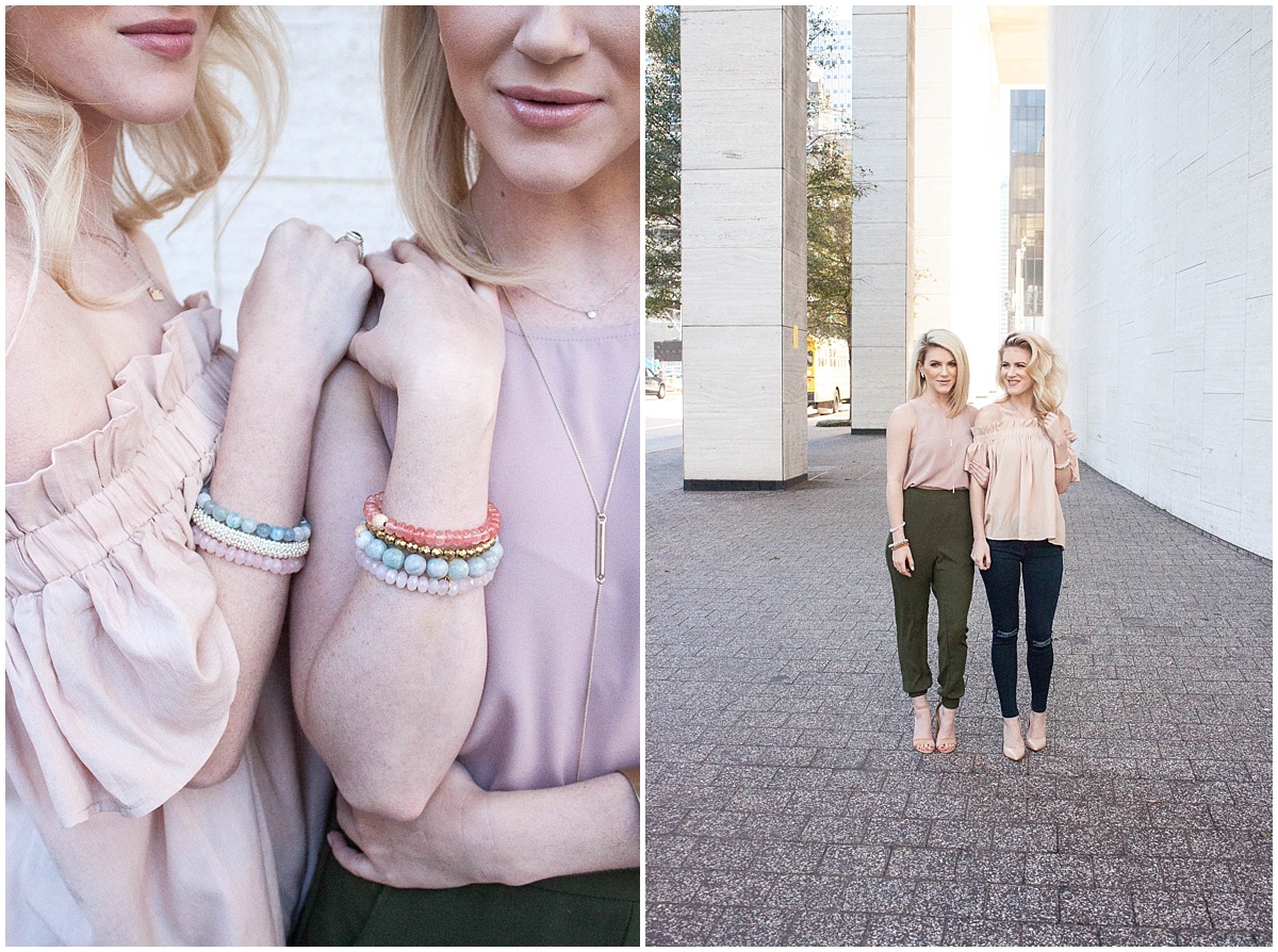 We really focused on the new Pantone 2016 hues in these looks! The colors of the year are Rose Quartz (all the heart eyes) and Serenity! Two colors that we are OBSESSED with. It’s really hard to find rose hues that go well with our ghostly white complexions! HA. HA. HA. We embrace it no matter how many times people call us little white dwarfs. Really, it’s fine. HOWEVER. H’s top is the perfect amount of paleness that it doesn’t wash us out and K’s crop top is such a cute fit with the thyme colored joggers, which is another complimentary Pantone this year! We were so honored to have Sisco + Berluti send us the perfect Pantone stacks that we just had to feature them this week! Sisco + Berluti is a premier beaded bracelet and accessories line that specializes in darling “stacks”! They create the perfect arm party and they are carried in stores such as Anthropology and Calypso. And to name a few fashionable women that have been seen wearing these stacks like Jessica Alba, Michelle Obama, and Rachel Bilson!  Go check them out, they have beautiful stacks with several different beads, styles, and colors!