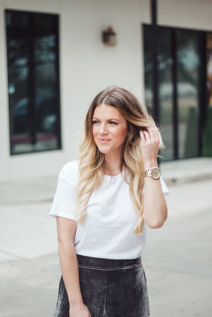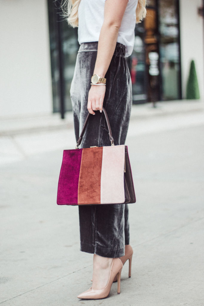 MADEWELL COTTON TEE | MADEWELL VELVET PANTS | ANTHROPOLOGIE PURSE | STEVE MADDEN HEELS | DAVID YURMAN BANGLE | DAVID YURMAN RING